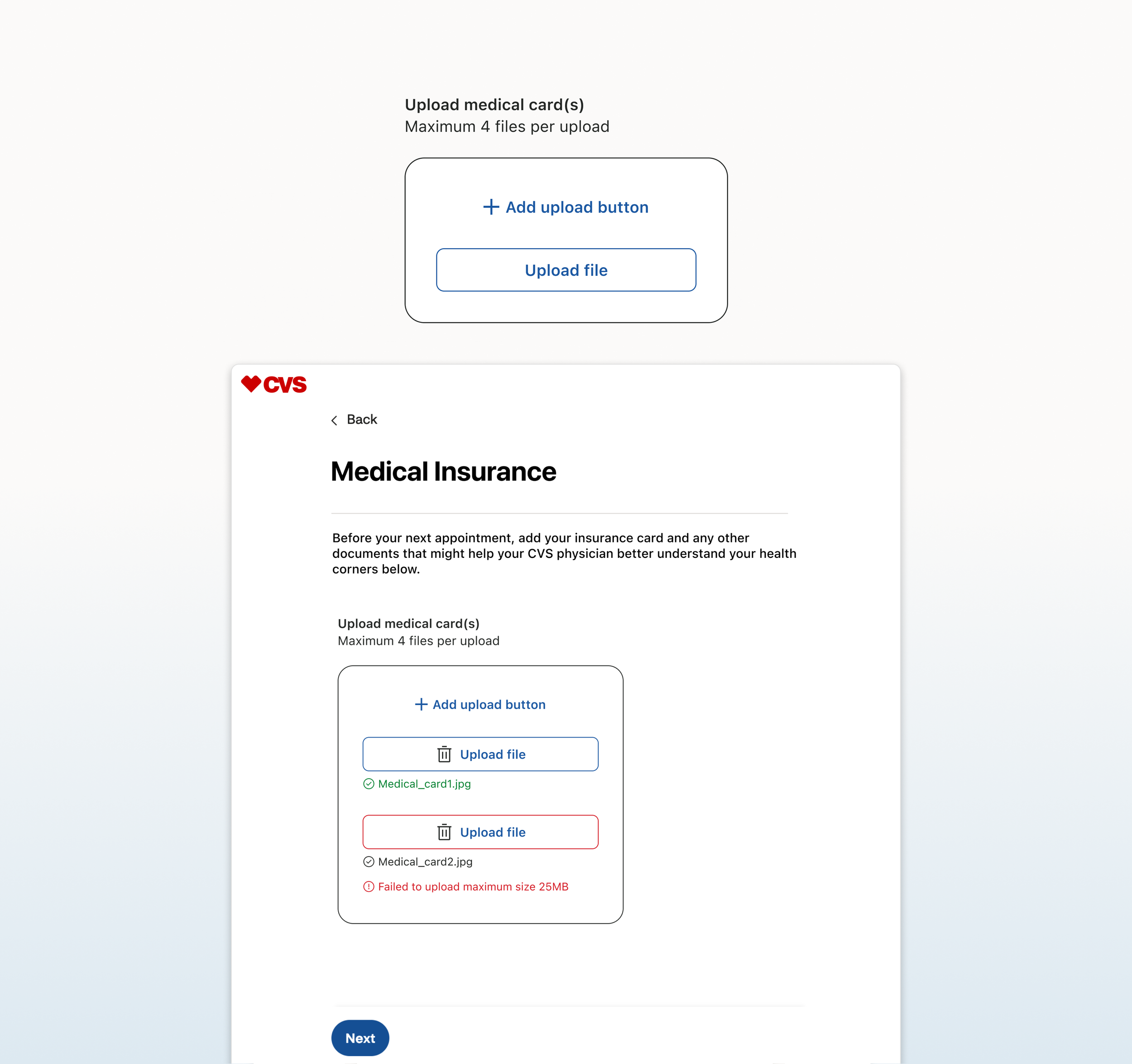 Designed a scalable file upload pattern supporting 1 to 4 files per instance, with dynamic UI behavior that adapts based on user actions and file states.